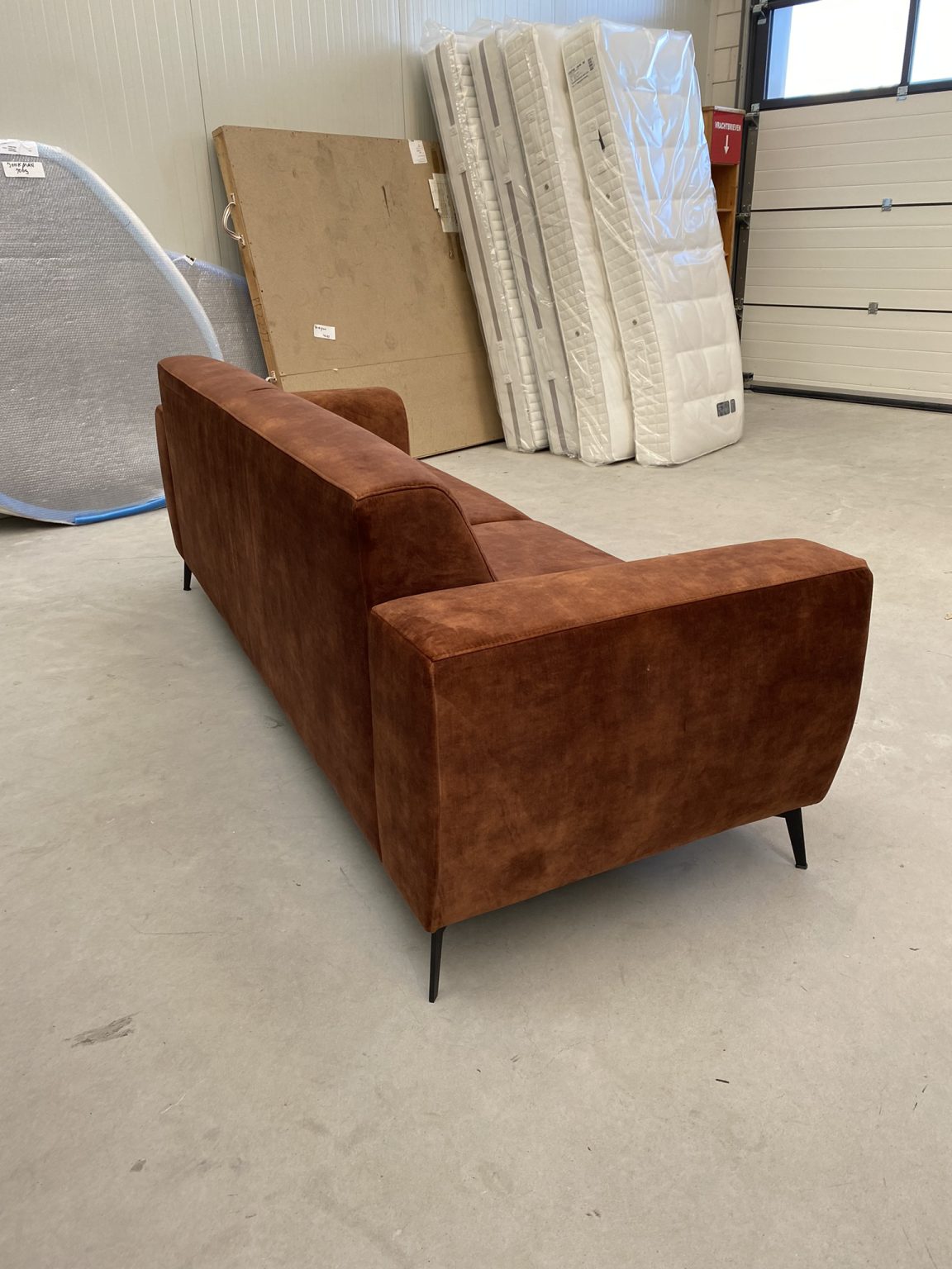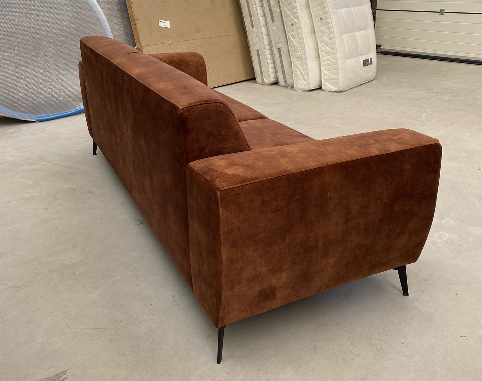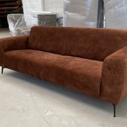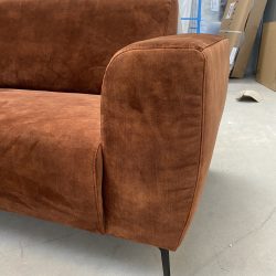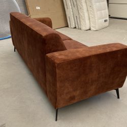 Stoere 3 zitsbank in adore stof donker cognac.