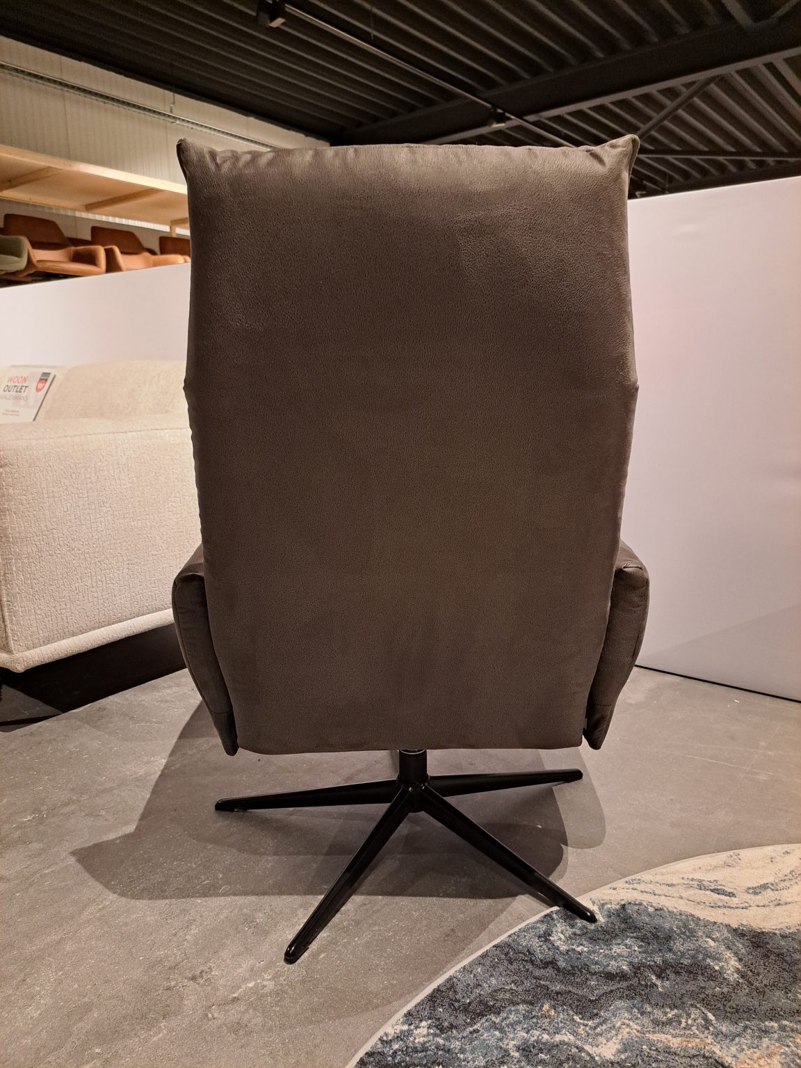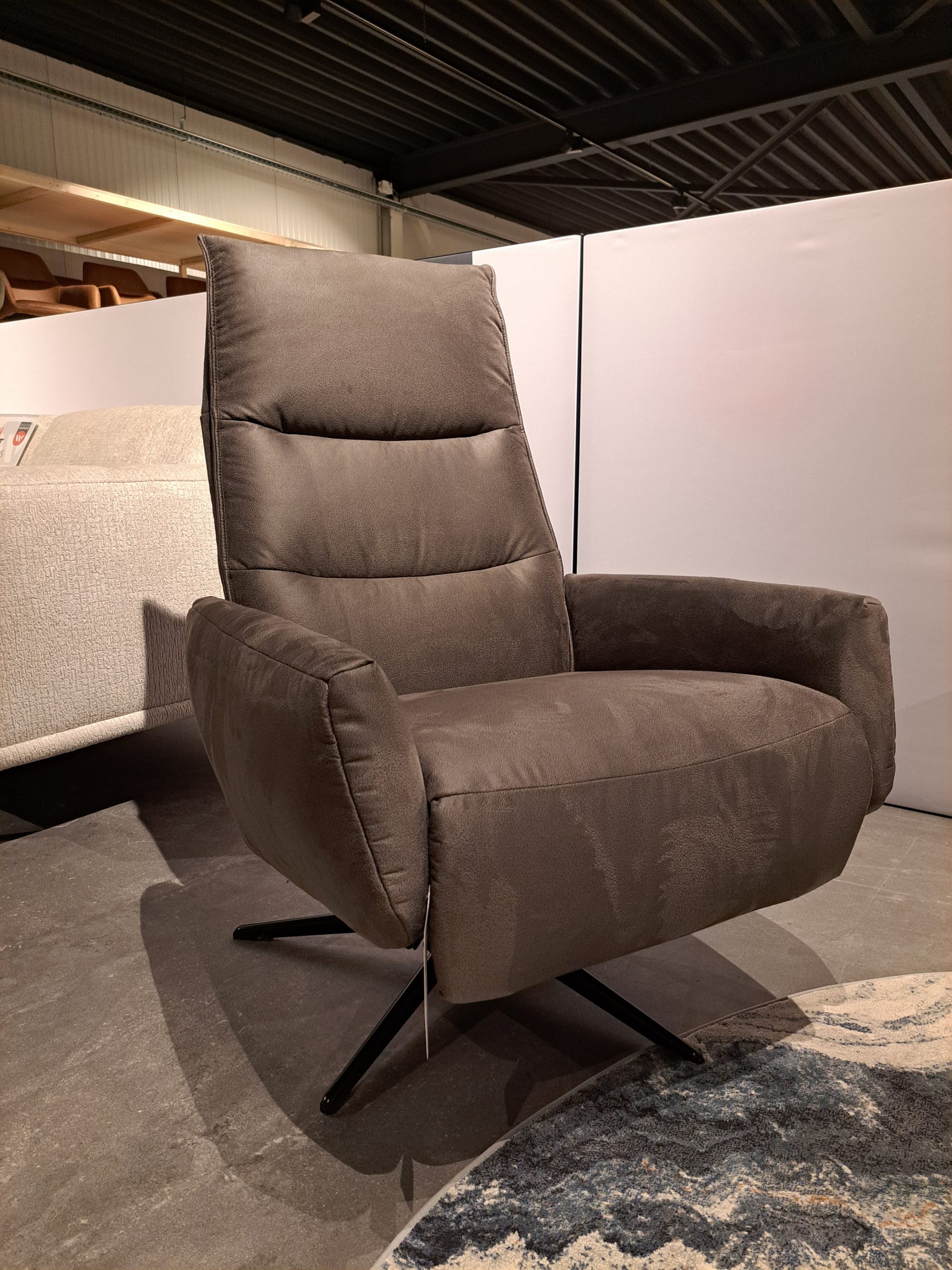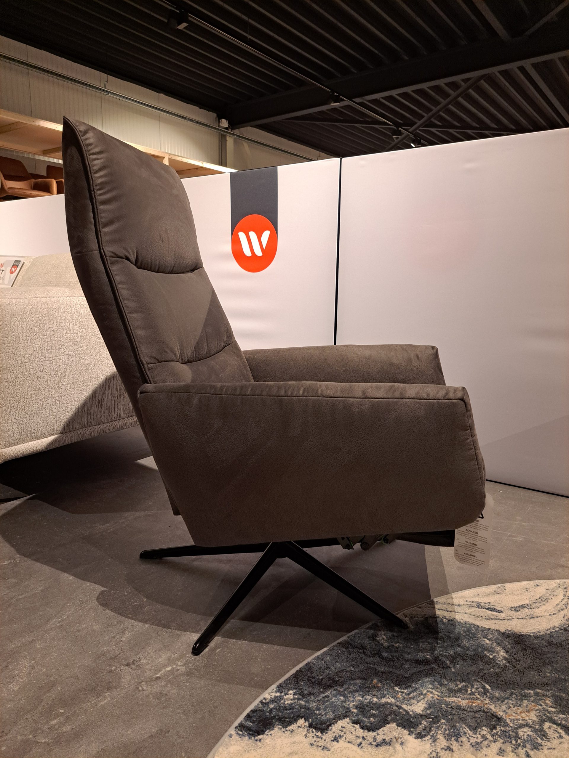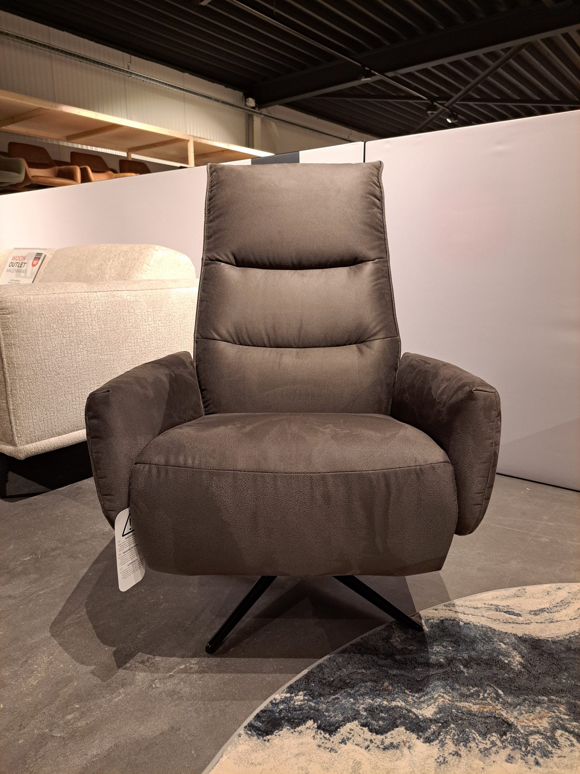 De Kim relaxfauteuil zit comfortabel en is manueel verstelbaar. De fauteuil is is bekleed in de stof Ranch Brown en heeft een zwart metalen stervoet.