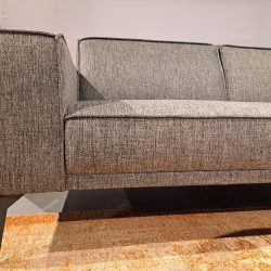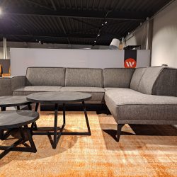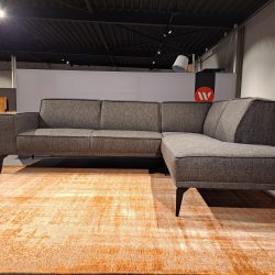 Deze eigentijdse hoekank Knautia is uitgevoerd in een antraciet weefstof. De is bestaat uit een 2 zits met voorstaand rechts een longchair. De bank heeft een strak design en zwarte poten. U kunt deze bank komen bewonderen in onze woonoutlet.