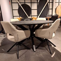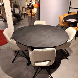 Wie denkt aan gezellig met elkaar kletsen aan tafel denkt ook al snel aan een ronde eettafel. De robuust gelakte mangotafel heeft een zwart blad met een gekruist zwart gepoedercoat onderstel. Deze ronde tafel past in iedere woonstijl. Is deze tafel iets voor jou? Bestel de tafel online of kom langs bij onze Woonoutlet in Lemelerveld.