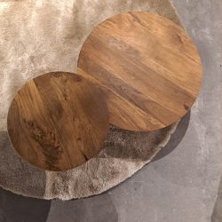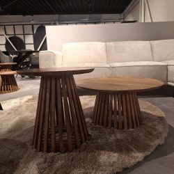 Deze gezellige Nathan salontafel set is volledig van Mangohout gemaakt en afgewerkt met een naturel lak. Het tafel blad heeft een gladde afwerking. De kolom poot bestaat uit latjes waardoor de tafeltjes net even anders zijn. Je kan de tafeltjes bij elkaar zetten maar het is ook leuk om het hogere tafeltje bij de fauetuil te zetten.