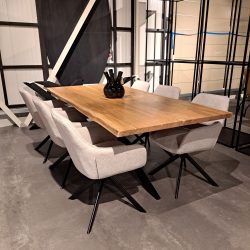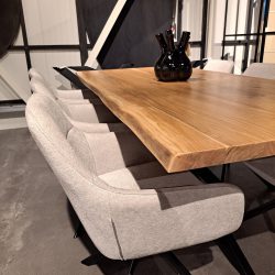 Deze prachtige Nicol boomstam tafel is perfect om avonden lang aan te tafelen. De Nicol eetkamertafel heeft een Massief acacia houten blad steunend op een zwarte spinpoot.