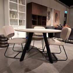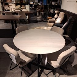 De ronde eettafel Nimaar is echt een eyecather. Het mangohoutenblad is glad afgewerkt en heeft een lichte finish, normaal is is mangohout een stuk donkerder. Het blad is verjongd aan de buitenrand waardoor deze optish dunner lijkt. De tafel heeft een diameter van 130 cm. De 4 stalen poten maken deze tafel compleet. Je kunt hier prima met 4 of 5 aan tafelen