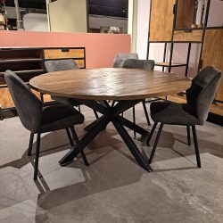 Een stoere eetkamertafel met ronde vorm, dat is eetkamertafel Wenum. De eetkamertafel heeft een diameter van 150 cm. Wenum heeft een Mangohouten blad en is naturel afgelakt. De eetkamertafel heeft een zwart metalen onderstel met een poedercoating. Liever een ander formaat? We hebben de Wenum eetkamertafel ook met een diameter van 130 cm. Kom de tafel bekijken in onze woonoutlet in lemelerveld.