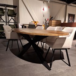 Een stoere eetkamertafel met ovale vorm, dat is eetkamertafel Wenum. De eetkamertafel is 240 cm lang en 110 cm breed. Wenum heeft een Mangohouten blad en is naturel afgelakt. De eetkamertafel heeft een zwart metalen onderstel met een poedercoating. Liever een ander formaat? We hebben de Wenum eetkamertafel ook met een lengte van 210 cm. Kom de tafel bekijken in onze woonoutlet in lemelerveld.