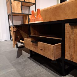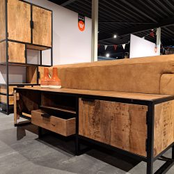 De stoere Wenum tv dressoir beschrikt over 2 deuren, 1 lade en 1 open vak. Door de combinatie van Mango hout en metaal krijgt de kast een industriele uitstraling. Het mangohout is naturel gelakt en het frame is zwart metaal gepoedercoat. De tv dressoir is 180 cm breed. Wilt u liever een maatje kleiner? Dat kan! De Wenum tv dressoir is er ook in een breedte maat van 140 cm.